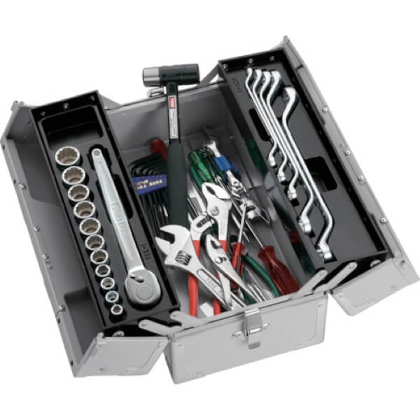 Tool set with assorted screwdrivers, pliers, hammer, chisels and drift pins 27 pieces on Safety-Insert-System (SIS) size 519 x 342 mm