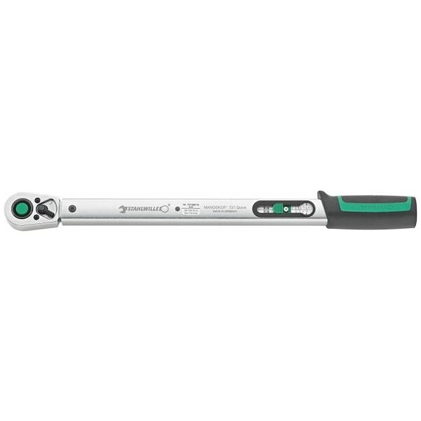 MANOSKOP Quick adjustable torque wrench twin scales Nm/ft-lb deviation value 4% length 452.5 mm with fixed QuickRelease ratchet 1/2 inch square drive size 30-150 Nm (25-110 ft-lb)