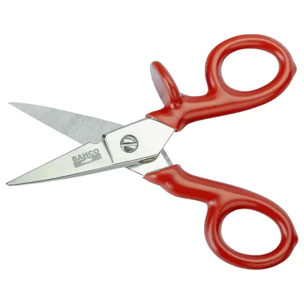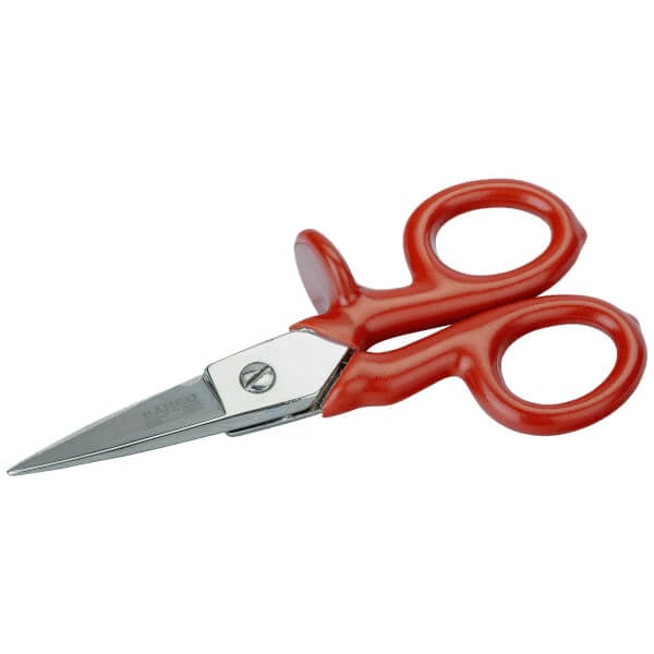 Electrician scissors with finger guard Dip-coated insulation for working on live up to 1000 V overall length 130 mm with small groove in the blade for stripping cables cutting length 50 mm VDE