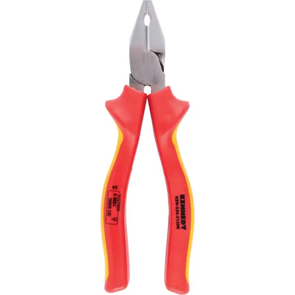 Insulated combination pliers chrome-plated, serrated jaws with induction-hardened cutting edges, two-component handle material. Overall length of 180 mm safe electrical applications up to 1000 V. VDE