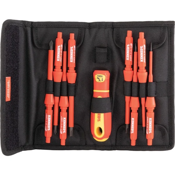 10-piece insulated, interchangeable screwdriver set features an ergonomic, full-size handle, as well as 8-interchangeable screwdriver bits for fastening applications requiring high torque, VDE-safe, supplied in a compact protective pouch