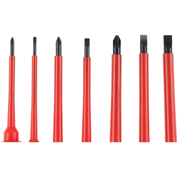 7-piece insulated VDE screwdriver set features insulated blades and magnetic tips made of fully insulated chrome vanadium steel and are tested to 1000 V AC. professional high-grip handles are robust and resistant to wear and tear