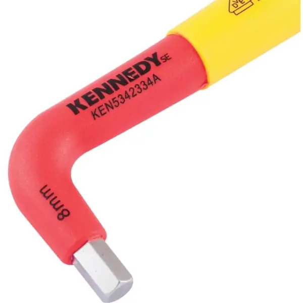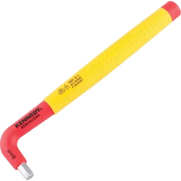 Insulated hexagon L-wrench provides precise control when tightening or loosening hex fasteners with insulated handle coating prevents electric shock and ensures a secure grip during live work, size 8 mm. VDE certified