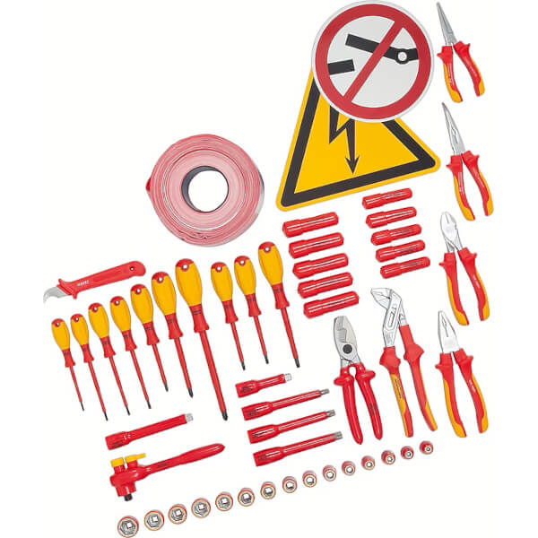 Set of insulated tools for electric or hybrid vehicles contain necessary tools 43 pieces eg. wrenches, sockets, screwdrivers, pliers in robust case made of break-proof X-ABS with telescopic handle VDE
