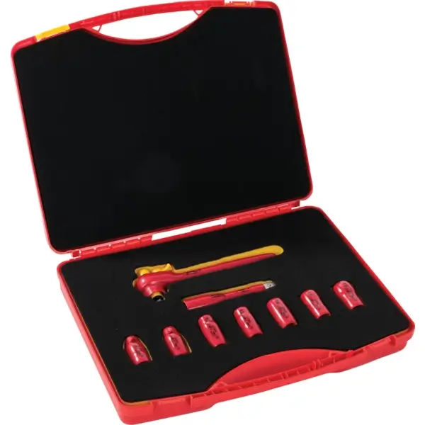 Insulated reversible ratchet, extension bar and insulated sockets with a square drive size 1/2 inch size 10-19 mm 9 pieces with multi-layer insulated for safe electrical applications up to 1000 V in a handy storage case VDE