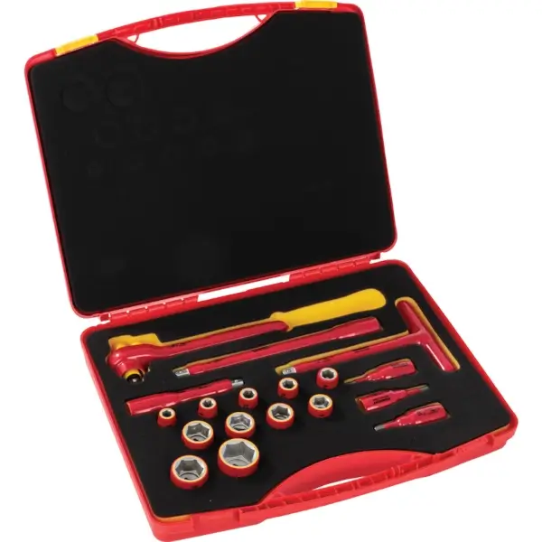 Insulated reversible ratchet, extension bars, T-handle and insulated sockets with a square drive size 1/2 inch size 10-32 mm 18 pieces with multi-layer insulated for safe electrical applications up to 1000 V in a handy storage case VDE