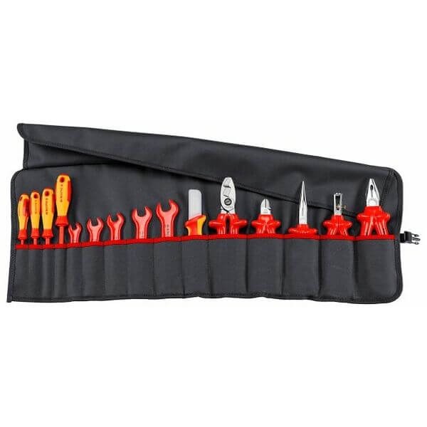 Tool Roll with insulated tools 15 parts for works on electrical installations in tool roll made of hard-wearing polyester fabric VDE