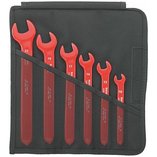 Set of Single-ended open-jaw spanner made of chrome alloy steel chrome plated with protective insulated up to 1000 V 6 pieces size 10-22 mm in polyester roll-up tool pouch VDE