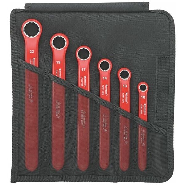 Set of Single-ended ring spanner made of chrome alloy steel chrome plated with 12-point AS-Drive profile and protective insulated up to 1000 V 6 pieces size 10-22 mm VDE in polyester roll-up tool pouch VDE