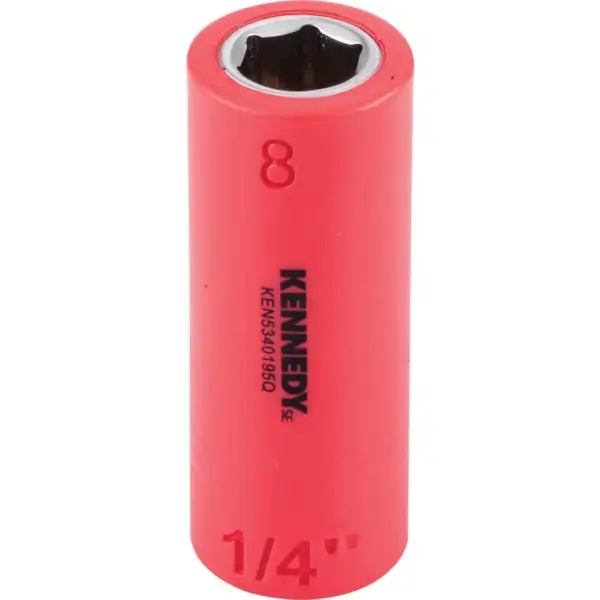 Insulated hexagon socket with a 1/4-inch square drive is made of high-strength chrome vanadium steel. Its impact-resistant VDE insulation prevents electric shock and improves user safety size 8 mm VDE certified