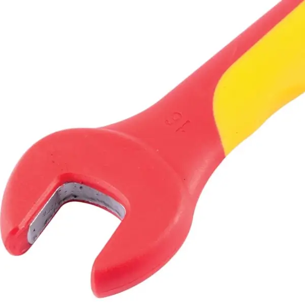 Insulated open-end wrench, slim design, forged from high-grade chrome-vanadium steel with ergonomic, non-slip handle. absolute safety when working on energised electrical installations, size 16 mm VDE certified