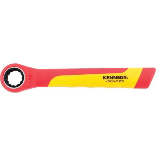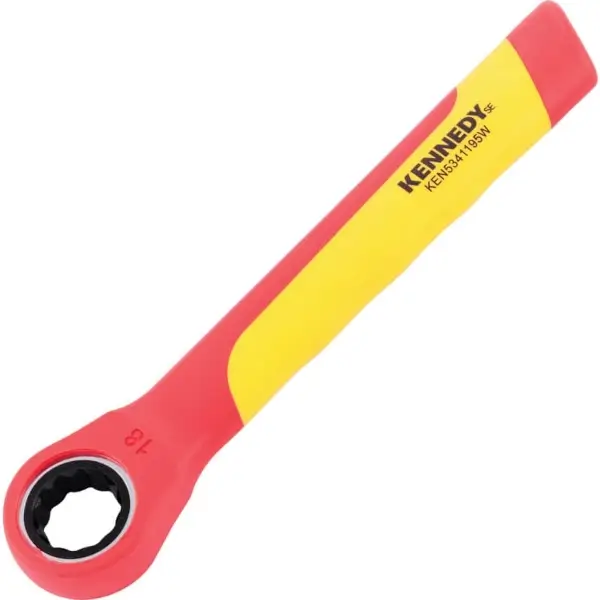 Insulated ratchet ring wrench features a fine-tooth ratchet mechanism and a fully insulated handle to prevent accidental contact with live components, thereby improving operator safety, VDE certified size 18 mm