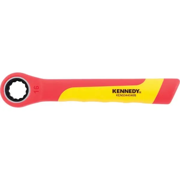 Insulated ratchet ring wrench features a fine-tooth ratchet mechanism and a fully insulated handle to prevent accidental contact with live components, thereby improving operator safety, VDE certified size 16 mm