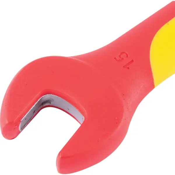 Insulated open-end wrench, slim design, forged from high-grade chrome-vanadium steel with ergonomic, non-slip handle. absolute safety when working on energised electrical installations, size 15 mm VDE certified