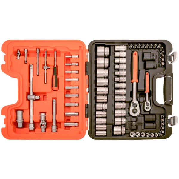 ชุดลูกบ๊อกซ์ 1/4 นิ้ว และ 1/2 นิ้ว จำนวน 63 ชิ้น มาพร้อมกับประแจขันกรอกแกรก, ข้อต่อตรง, ข้อต่ออ่อน, ลูกบ๊อกซ์หกเหลี่ยม ขนาด 4-30 มม. บรรจุในกล่องพลาสติก ABS