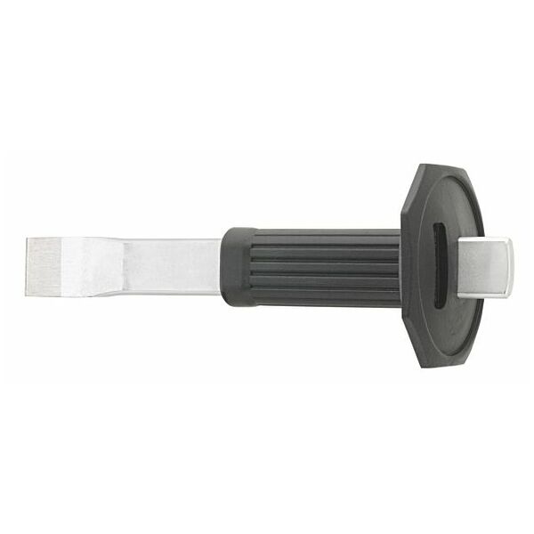 สิ่วสกัดปากแบน พร้อมการ์ดมือ ทำจากเหล็กกล้าหลอมชุบแข็งสม่ำเสมอ 54-58 HRC เคลือบแล็กเกอร์ ขนาดใบมีด 7 x 26 มม. ความยาวทั้งตัว 240 มม.