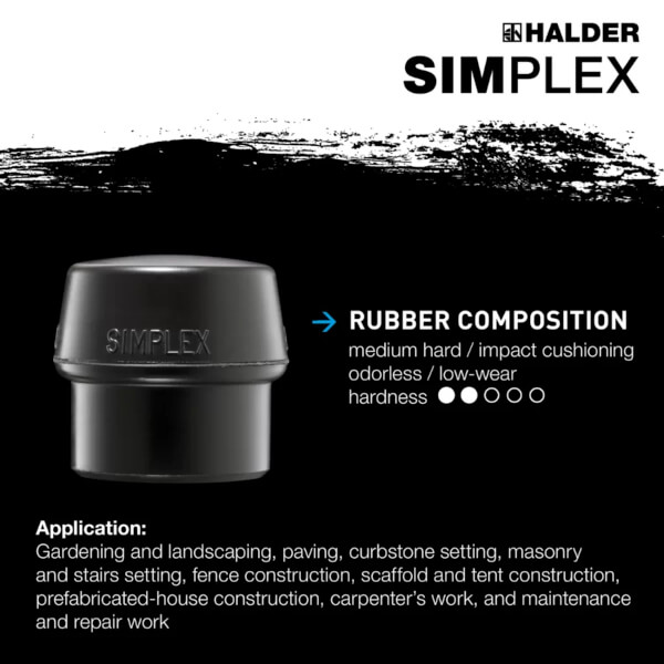 SIMPLEX ค้อนหน้าอ่อน หัวค้อนทำจากยางสีดำ มีค่าความแข็งปานกลาง ทนต่อแรงกระแทกสูง โครงทำจากเหล็กหล่อ ด้ามจับไม้ ความยาวทั้งตัว 325 มม. ขนาด 40 มม.