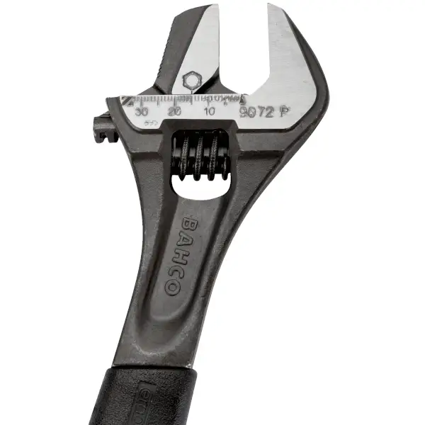 ประแจเลื่อน หัวประแจทำมุม 15 องศา ผลิตจากเหล็กพิเศษเคลือบฟอสเฟต มีมาตราส่วนที่ปากประแจ ความยาวทั้งตัว 306 มม. ปากเปิดได้กว้างสุด 38 มม.