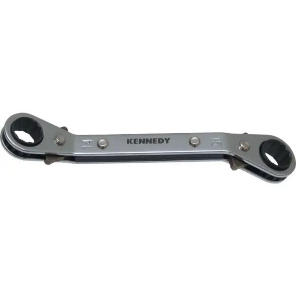 ประแจแหวนกรอกแกรก มี 4 ขนาดในตัวเดียว ผลิตจากเหล็กโครงสร้าง ผิวขัดเงาด้าน ยาวทั้งตัว 190 มม. สำหรับขันและคลายน็อตหกเหลี่ยม ขนาด 12 x 14, 13 x 15 มม.