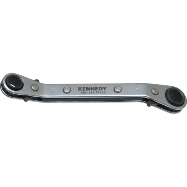 ประแจแหวนกรอกแกรก มี 4 ขนาดในตัวเดียว ผลิตจากเหล็กโครงสร้าง ผิวขัดเงาด้าน ยาวทั้งตัว 190 มม. สำหรับขันและคลายน็อตหกเหลี่ยม ขนาด 12 x 14, 13 x 15 มม.