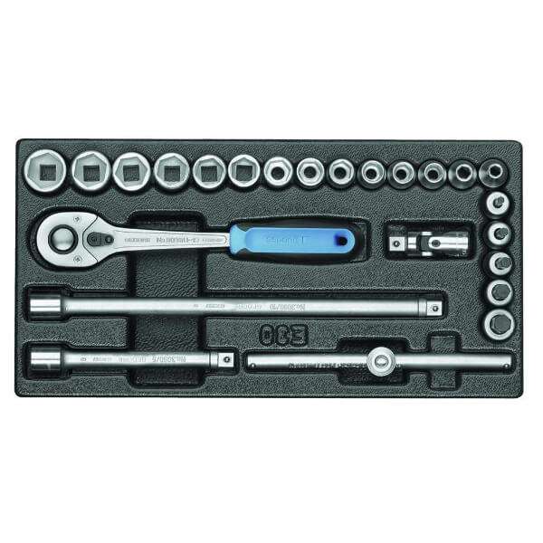 ชุดลูกบ๊อกซ์หกเหลี่ยม หัวขับสี่เหลี่ยม 1/4 และ 1/2 นิ้ว มาพร้อมกับด้ามขันกรอกแกรกฟันละเอียดแบบ HiPer ข้อต่อตรง ดอกไขควงและด้ามขันแบบสไลด์ รวมจำนวน 56 ชิ้น จัดเรียงบนโฟม Safety-Insert-System (SIS) ขนาด 519 x 342 มม.