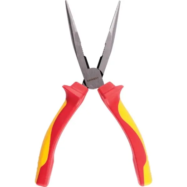 คีมปากแหลมงอ 40 องศา ชุบโครเมี่ยม มีคมตัดด้านข้าง คมตัดแข็ง 61 HRC ด้ามจับหุ้มฉนวนกันไฟฟ้า ขนาด 200 มม. VDE