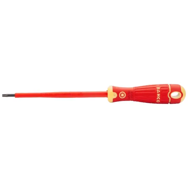ไขควงปลายบ๊อกซ์หกเหลี่ยม ทำจากเหล็กโครมวานาเดียมโมลิบดีนัม แกนยาว 125 มม. ด้ามจับหุ้มฉนวนกันไฟฟ้า ขนาด 4 มม. VDE