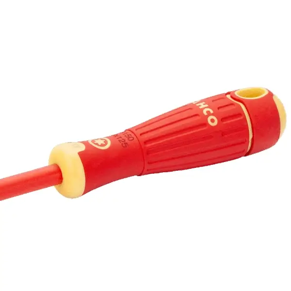 ไขควงปลายบ๊อกซ์หกเหลี่ยม ทำจากเหล็กโครมวานาเดียมโมลิบดีนัม แกนยาว 125 มม. ด้ามจับหุ้มฉนวนกันไฟฟ้า ขนาด 8 มม. VDE