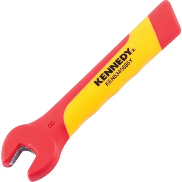 ประแจปากตายข้างเดียว ทำมุม 15 องศา ทำจากเหล็กโครเมี่ยมวาเนเดียม ด้ามจับหุ้มฉนวนกันไฟฟ้า ยาวทั้งตัว 145 มม. ขนาด 15 มม. VDE