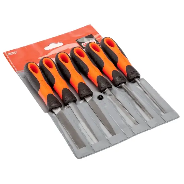 工程锉刀套装(平滑切割),适用于精细锉削与抛光作业,含平锉、护边锉、方锉、三棱锉、圆锉及半圆锉,长度100毫米,配Ergo人体工学舒适手柄,收纳于塑料卷式收纳袋
