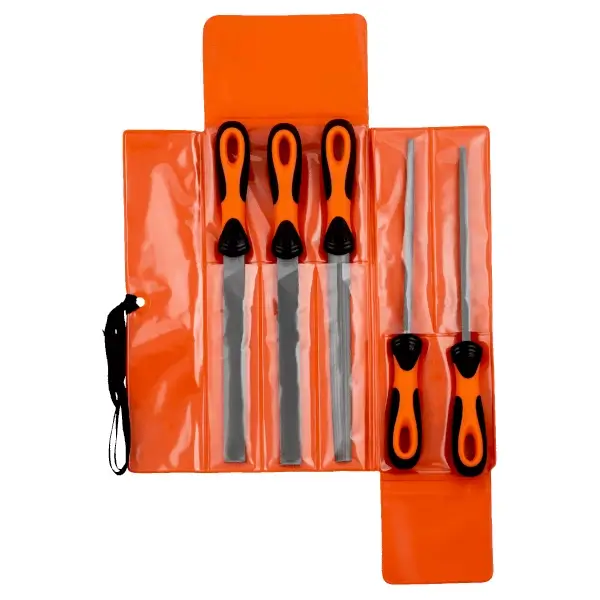 工程锉刀套装,用于去毛刺和表面锉削,包含平锉、方锉、圆锉、半圆锉(粗齿锉)及一把长200毫米的平锉(细齿锉),配Ergo舒适手柄,收纳于塑料卷式收纳袋