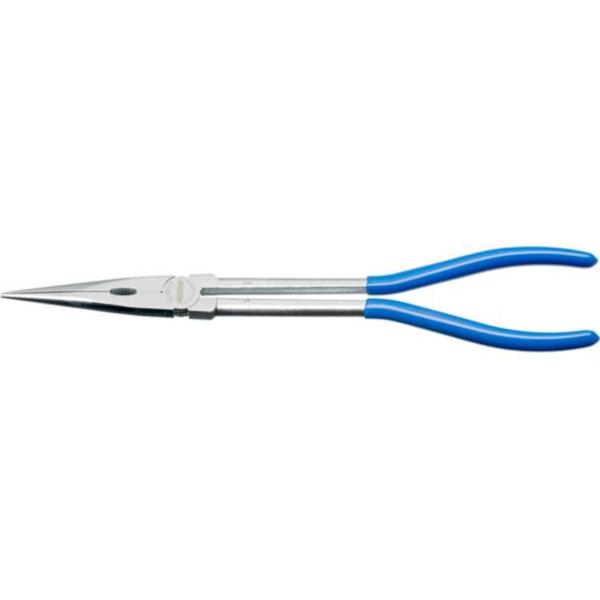 超长尖嘴钳,采用油淬特殊工具钢制成,镀铬处理,带锯齿状抓握表面,聚氯乙烯手柄长度280毫米