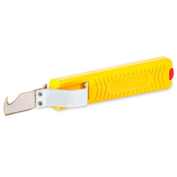 Cable knife with hook blade, TiN-coated blade, depth adjustable and automatic adjustment to round and longitudinal cut, housing is made of high-quality, wear-resistant polyamide suitable for stripping round cables diameter 8 – 28 mm