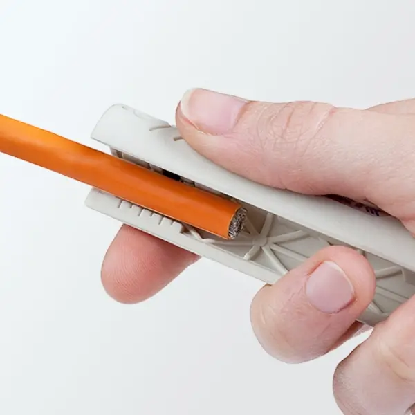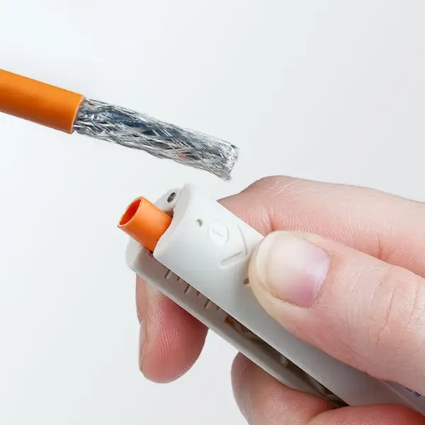 Cable stripper with TiN-coated blades longer service life consisting of 2 pairs of blades for outer sheath and foil shielding suitable for PVC-insulated CAT and network cables diameter 4.5 – 10 mm