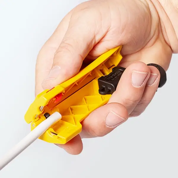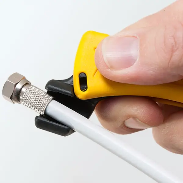 Coaxial cable stripper with marking symbols for easy identification of the stripping stages integrated with socket wrench 11 mm for tightening F-connectors suitable for all common coaxial cables with a diameter 4.8 – 7.5 mm