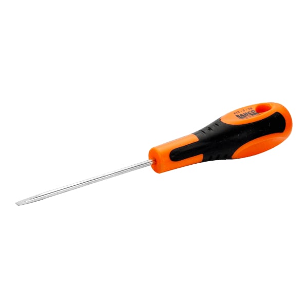 符合人体工学的平头直螺丝刀,由高性能合金钢制成,镀铬处理,使用寿命长,配有软质材料手柄,可实现卓越的抓握力和更大的力传递,刀片长度 75 毫米,尺寸 0.6 x 3.5 毫米
