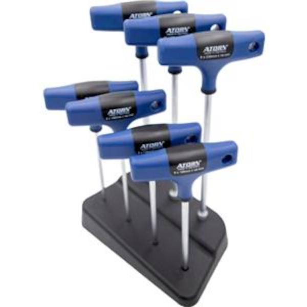 T型手柄内六角螺丝刀,采用铬钒合金镀铬材质,配易握软质涂层手柄,7件装规格3-13毫米,置于坚固稳定的塑料工作台支架中