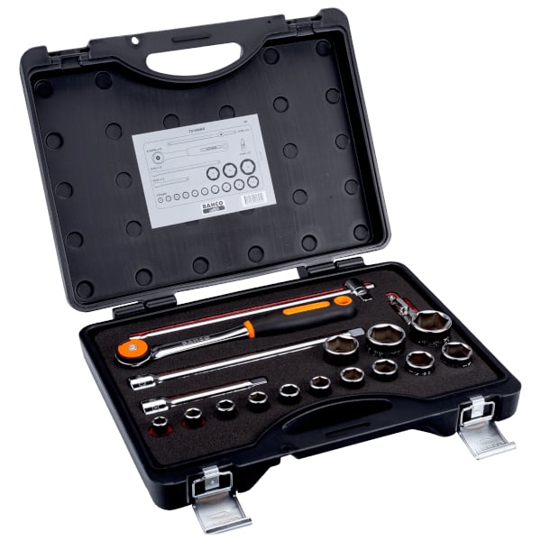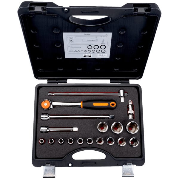 套筒组 1/2 英寸方头,带公制六角套筒 10-32 毫米,含圆头可逆棘轮和延长杆,18 件,塑料箱装