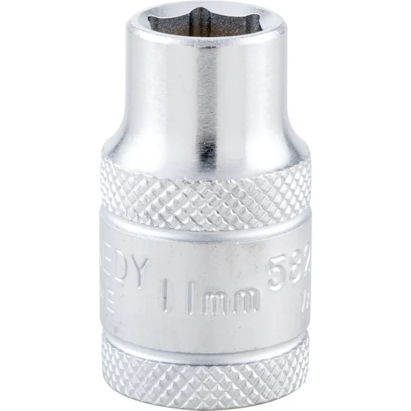 Hexagon socket with 1/2-inch square drive, chrome vanadium steel with polished finish, offers more positive location on worn or rounded nuts, overall length 37 mm size 11 mm