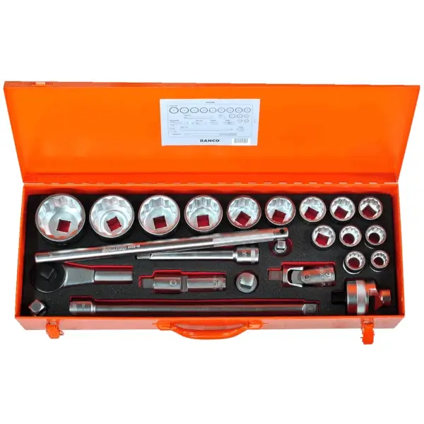 3/4英寸双六角套筒套装,规格19-60毫米,含双向棘轮头、滑动头、万能手柄、万向节、减径接头、双向棘轮接头、撬杆及延长杆,金属箱装