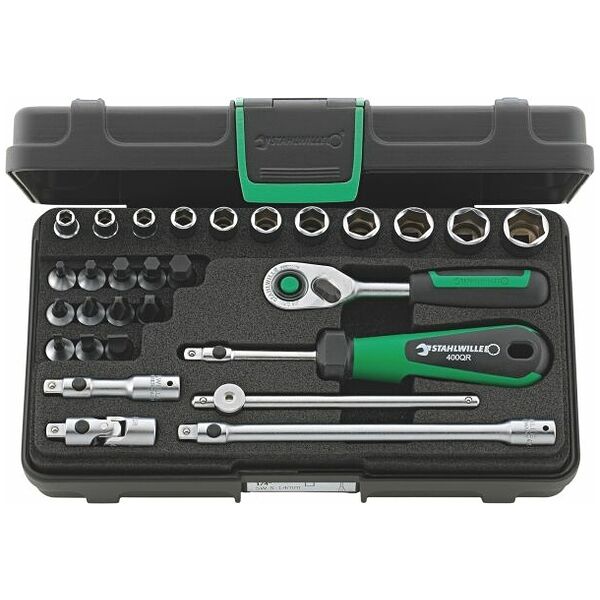 1/4英寸方头套筒组,采用AS-Drive六角轮廓设计,由HPQ高性能钢制成,规格5-14毫米,含快速释放细齿棘轮和延长杆,共29件