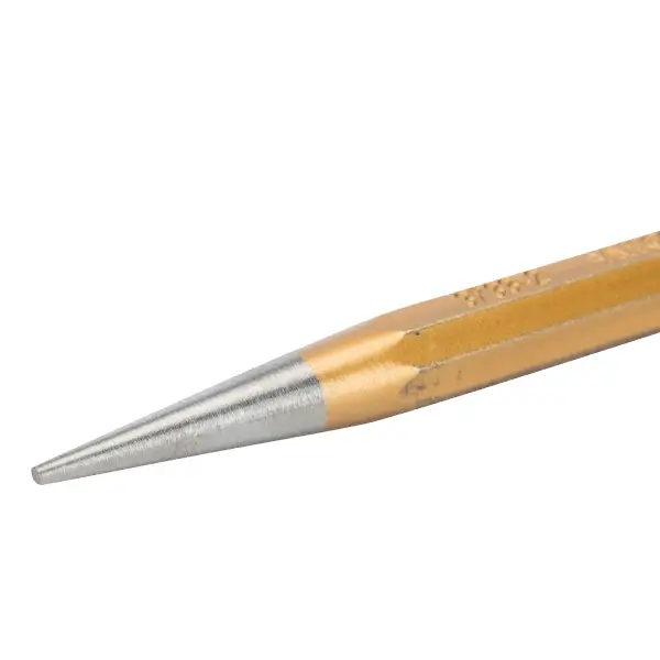 带安全冲击头的锥形冲头,由高性能合金钢制成,涂有铜色漆面,八角柄10毫米,总长120毫米,尖端直径5毫米