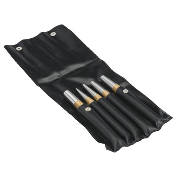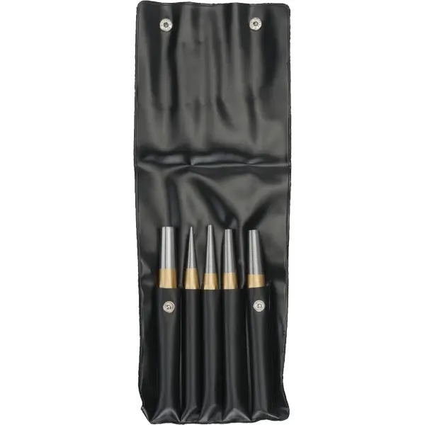 锥形冲头套装,带安全冲击头,由高性能合金钢制成,铜色漆面,八角柄10毫米,总长120毫米,6件装,尺寸2/4/6/8/10毫米,塑料袋包装