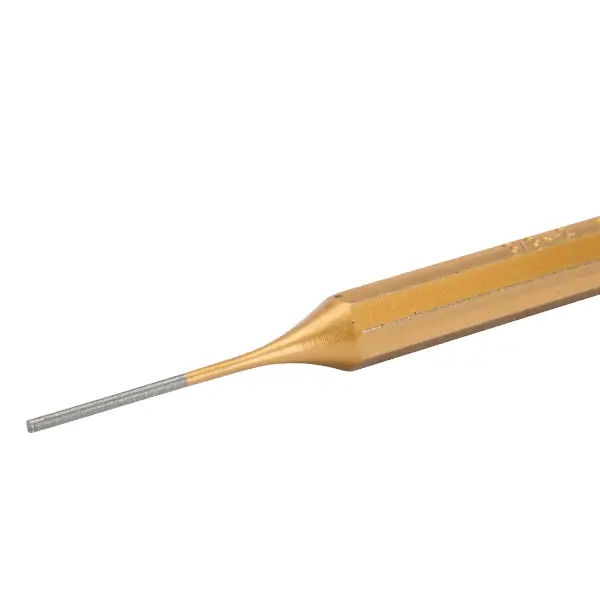 带安全冲击头的圆柱形冲头,由高性能合金钢制成,铜色漆面,八角柄10毫米,总长150毫米,尖端直径3毫米