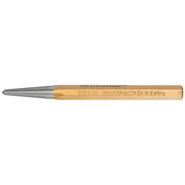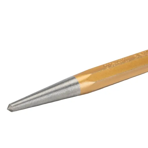 带安全冲击头的中心冲头,由高性能合金钢制成,铜色漆面,八角柄12毫米,总长120毫米,尖端直径5毫米