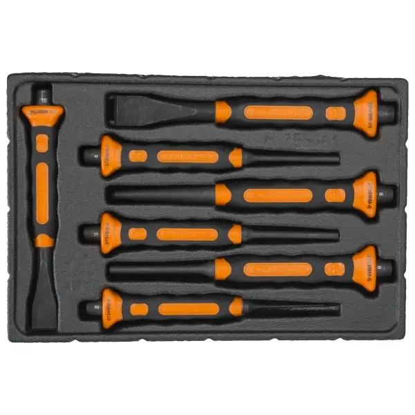 中心冲、凿子和冲头套装,配备双组分手柄,握持舒适且使用更安全,尖端硬度56-58 HRC,7件装于塑料托盘中