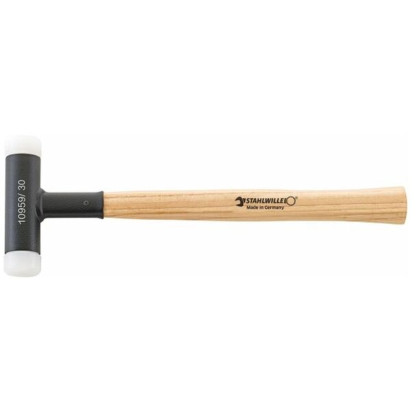 带可更换锤头的缓冲锤,采用中硬度聚氨酯材质(73 Shore硬度),山核桃木手柄,长度355毫米,锤头直径40毫米,重量760克