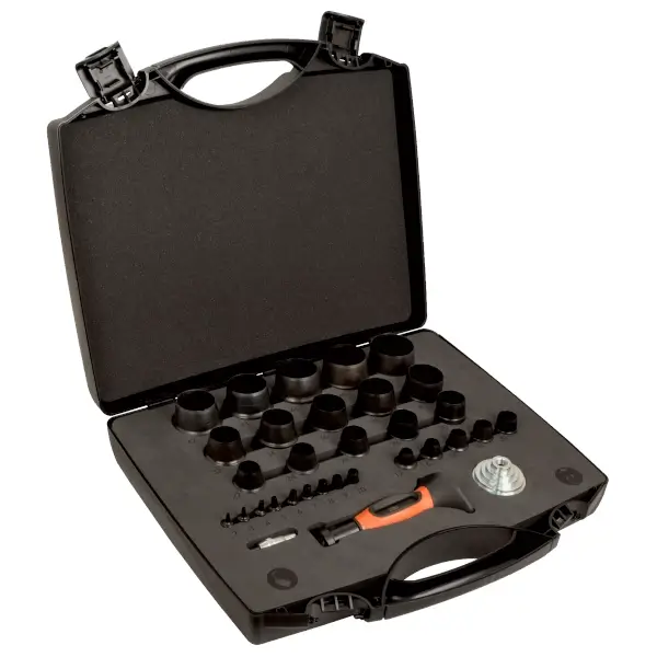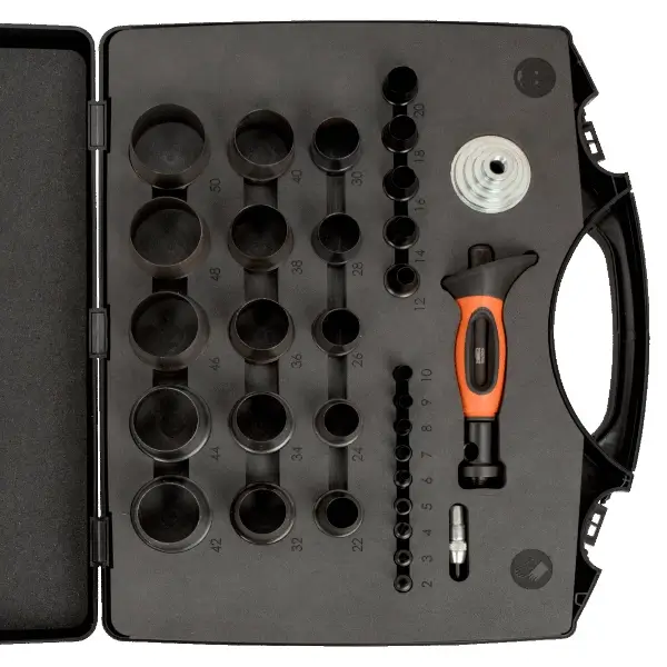 带人体工学手柄和适配器的可互换垫片冲孔器套装,用于切割泡沫、皮革、纸板、橡胶、纤维和塑料,32件规格2-50毫米,耐用塑料盒装