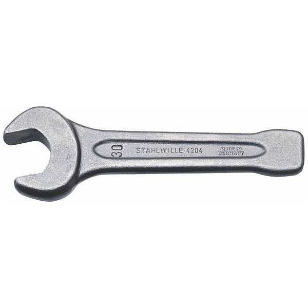 符合DIN 133标准的开口式敲击扳手,采用特殊工具钢制成,灰色表面处理,长度445毫米,颚厚38毫米,尺寸90毫米