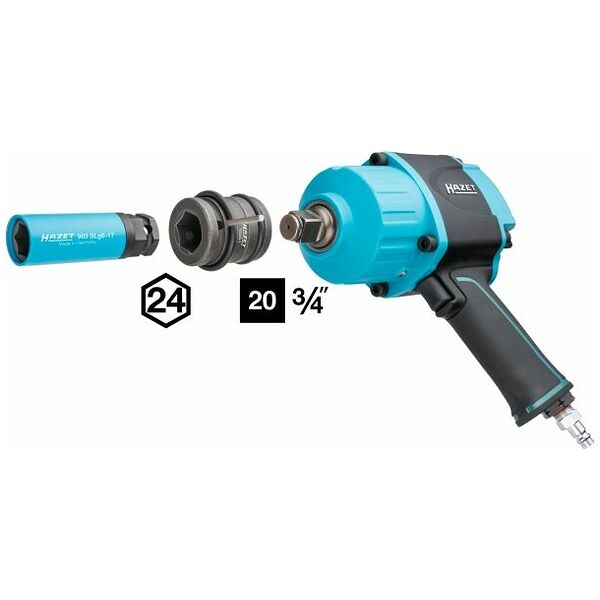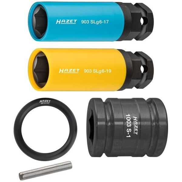 1/2 英寸方形驱动和 24 毫米六角驱动的长冲击六角套筒套件,带塑料套筒和 6 点牵引轮廓,长度 87 毫米,尺寸 17、19 毫米,带适配器。